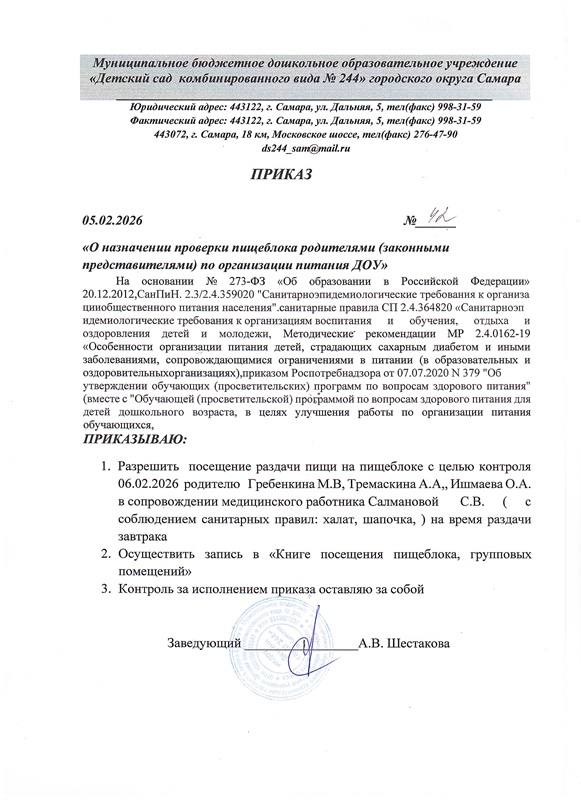 Приказ № 42 от 05.02.2026 «О назначении проверки пищеблока родителями по организации питания ДОУ»