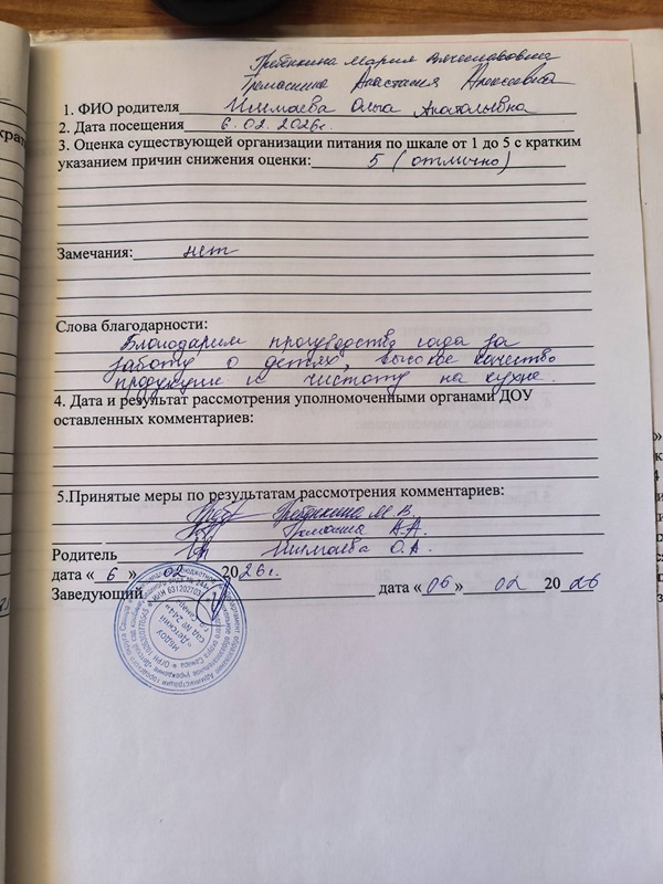 Акт посещения родительским контролем пищеблока от 05.02.2026 г.